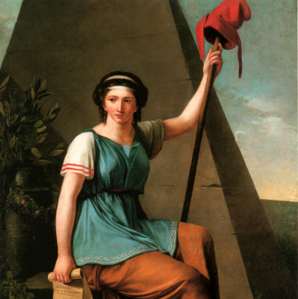 Men också egensinnigt. Liberté tronar framför en egyptisk pyramid, en symbol för enighet och universalism. Eller om det är en symbolisk pyramid för det feodala samhällets hierarkier? Hon är i blickfånget. Rakryggad, arbetsklädd, i en vilopose. Detta är en karaktär med oerhörd styrka. Jordnära, inte utomjordisk. Levande person, inte främst allegori. Hon skulle kunna vara vem som helst av de unga kvinnorna i den avgörande Kvinnomarschen den femte oktober 1789.