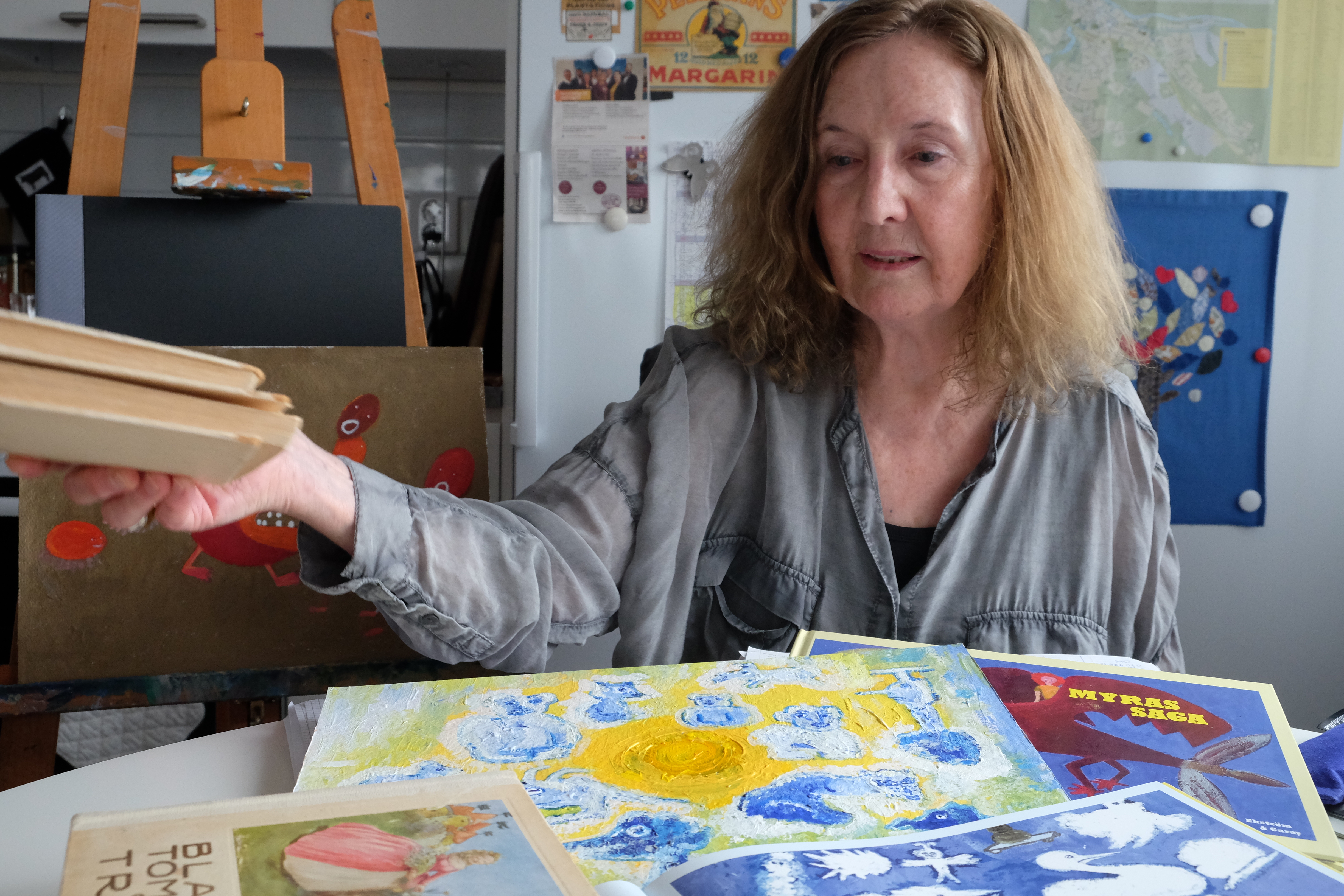 – Jag tar fram barnet inom mig men måste vara vuxen också. Jag skriver inte direkt, det tar mycket längre tid än att måla. Jag bearbetar och jobbar om efter berättelsen. Då anpassar sig texten och bokstäverna.