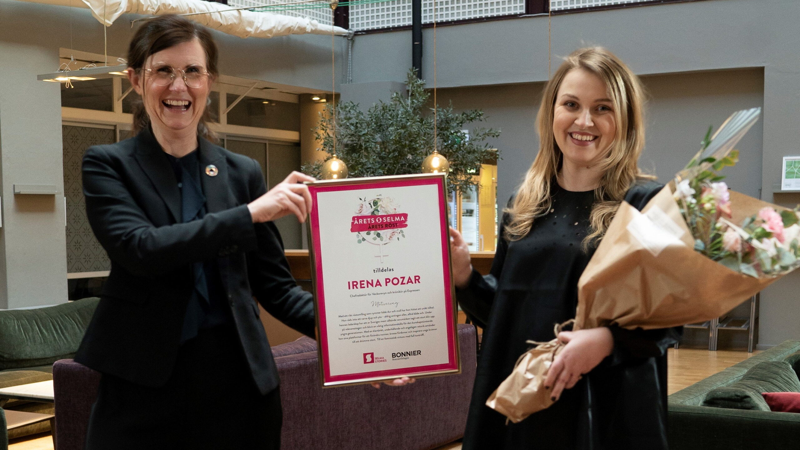 Veckorevyns chefredaktör Irena Pozar tilldelas pris i kategorin ”Årets röst” för hur hon ”med en klartänkt, underhållande och angelägen retorik använder sina plattformar för att förändra normer, krossa fördomar och inspirera unga kvinnor till att drömma stort”.