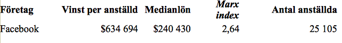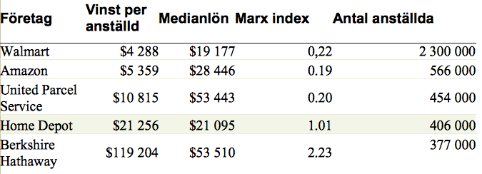 Marx ratio eller Marx index visar relationen mellan ett företags vinst per anställd och hur mycket en genomsnittlig arbetare kompenseras för sitt arbete. I Home Depot, en detaljhandelskedja som specialiserar sig på att sälja produkter rörande inredning och byggnadsmaterial till slutkunder, var indexet 1.01. Det betyder att vinsten per anställd var ungefär lika stor som medianlönen i företaget.