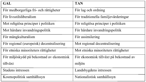 Politiken har flera dimensioner där olika aktörer kan enas i olika frågor. GAL–TAN-konflikterna handlar om synen på samhällets och människans utveckling. För GAL-förespråkarna är invandringspolitiken och kosmopolitismen frågor som man kan enas kring. Invandring och mångfald är långt ifrån problemfria företeelser, men inkluderaring av fler människor stärker och berikar samhället på lång sikt.