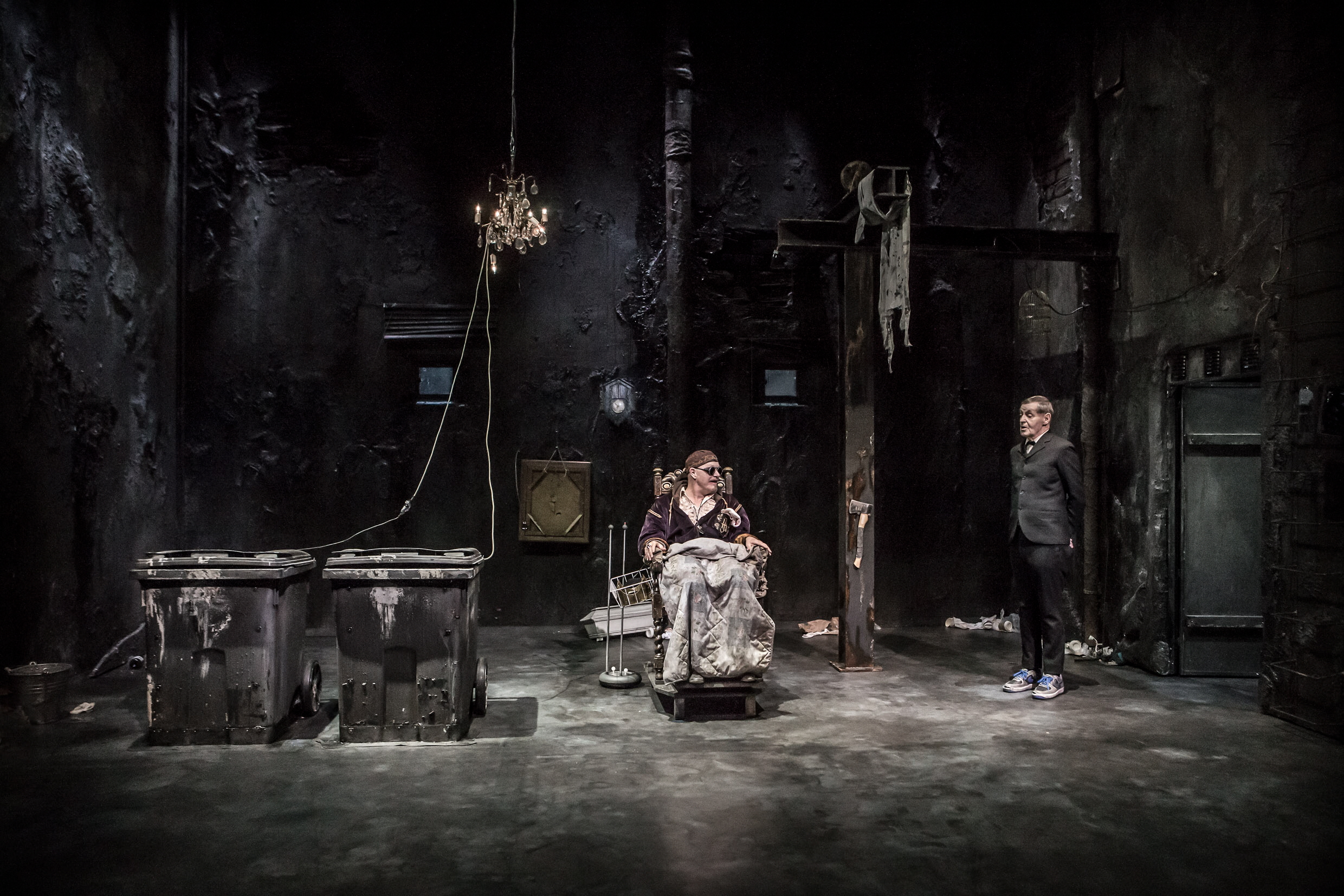 ISCENSÄTTNING. ”När man läser den Beckettska protesten förstår man iscensättningens enkelhet. Vad som behövs är ett kalt rum med två små fönster som sitter högt upp. Två soptunnor syns i förgrunden. I mitten sitter den blinde huvudpersonen Hamm i en karmstol”, skriver Percival.